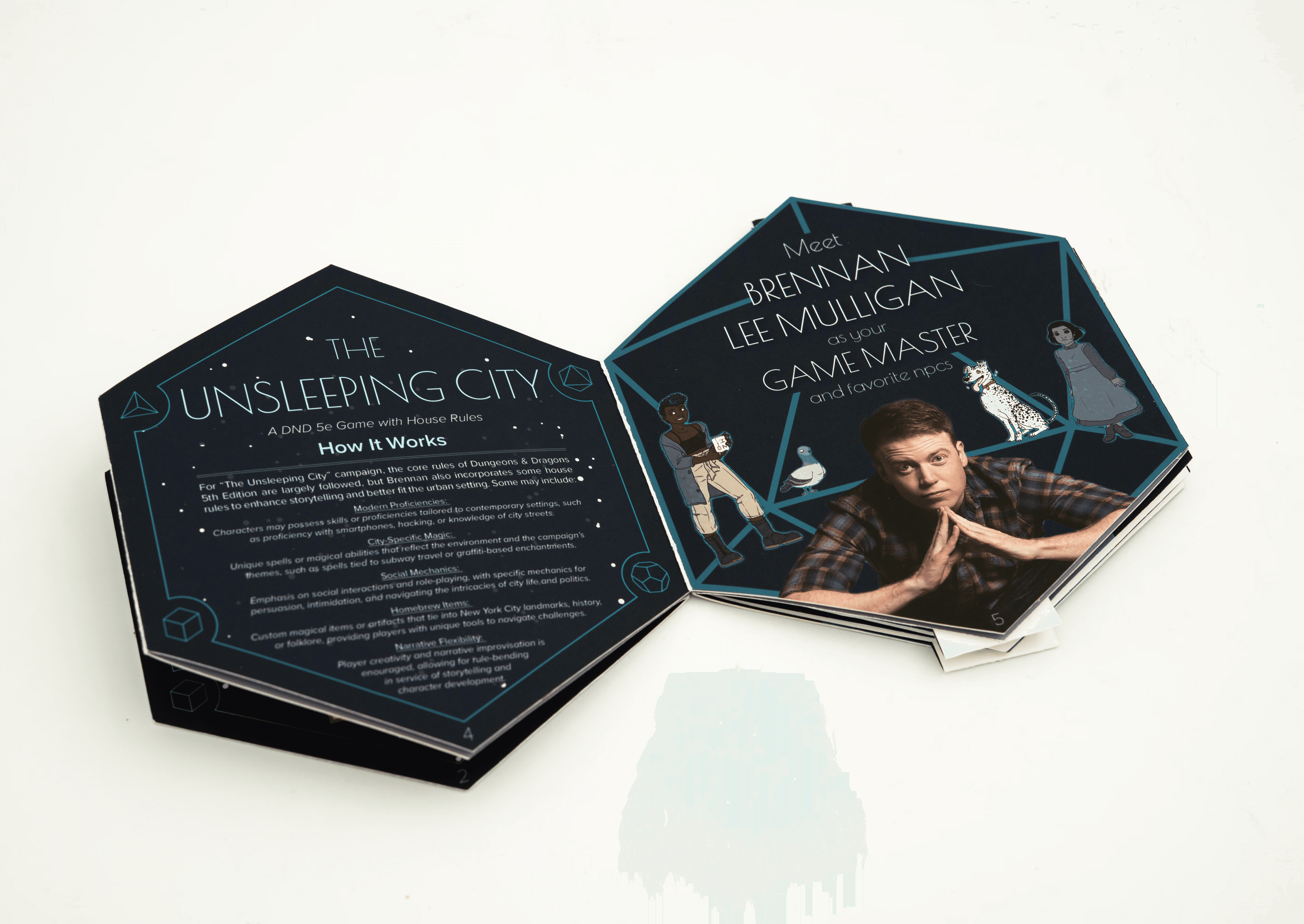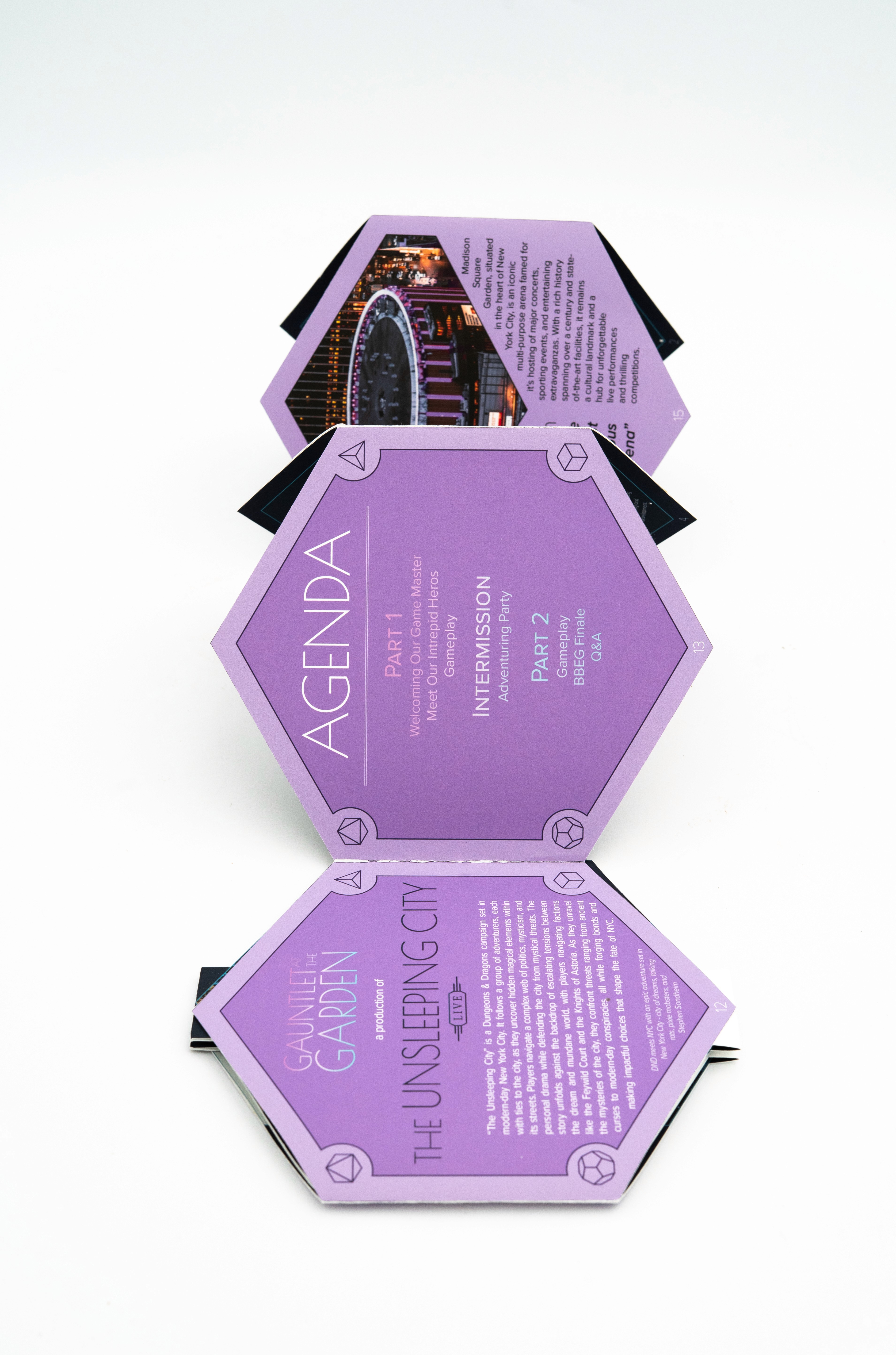 The Concept: Dimension 20 is a collection of fantastical and adventurous tabletop role-playing game (TTRPG) campaigns played by comedians and pro gamers "Gauntlet At The Garden" is a live show following the events of the popular campaign "The Unsleeping City" This booklet would be given to the audience members before the event starts to get an idea of what TTRPGs are, what the event is, who the characters are, and a highlight of the venue known as The World's Most Famous Arena.